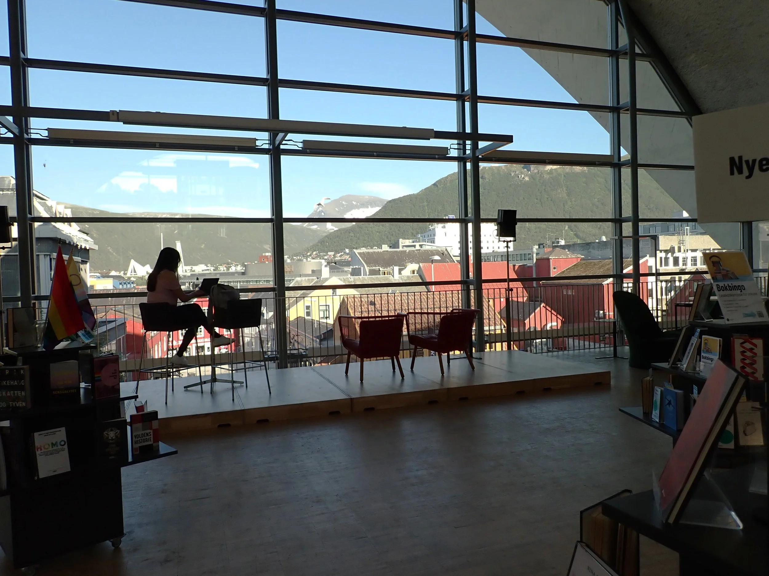 Tromssas ol kaikkist kaunein kirjasto, mitä ikimailmas olen nähny (sanota nyy et ikieuroopas, ko en ol ollu tält manterelt pois ikinä): valtava valo, nätti oorninki ja akkunas vuaret Jäämeren takan.