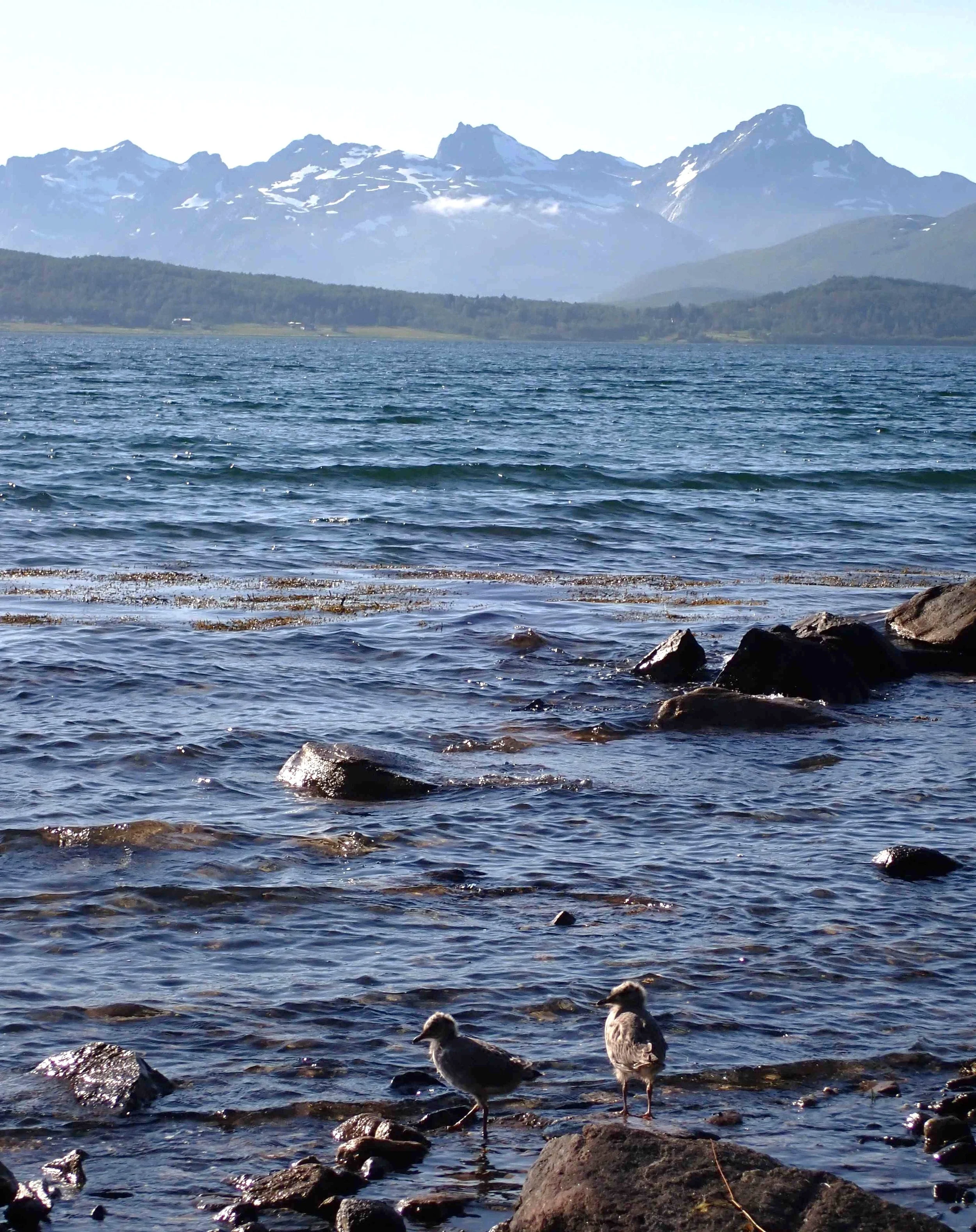 Kalalokinpoikassi Tromssan etelärannal. Takan näky lumihuiput - mikä onni, et heinäkuussaki niit viäl o! Kuva: Heli Laaksonen